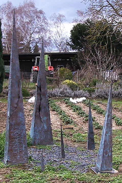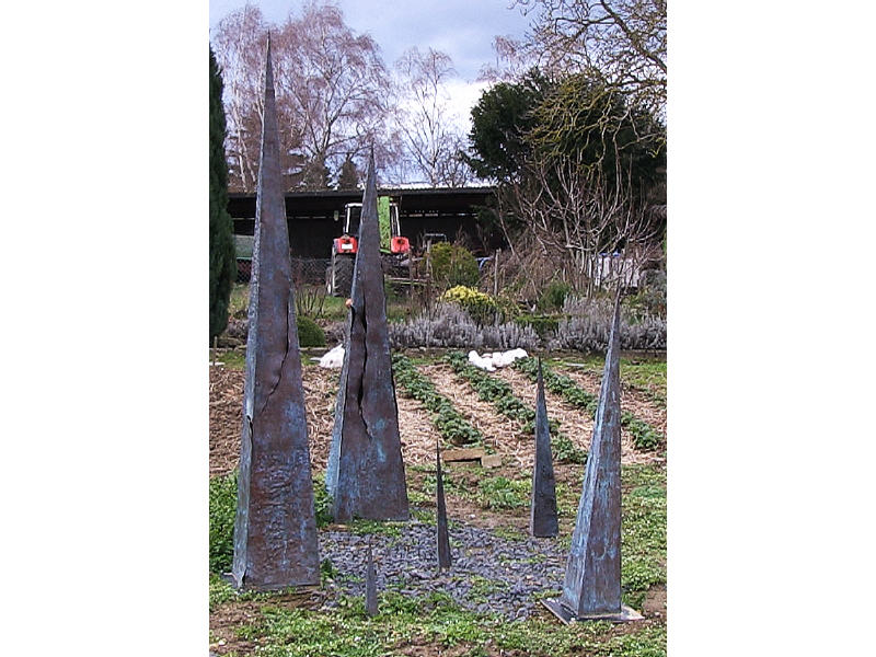 Sie spielt z.B mit der klarer,geschlossener Form.Dann bricht sie diese.Diese scheinbar klare Form,wird durchsichtig.Assoziativ entsteht derEindruck von Verletzlichkeit,Verletzbarkeit,nicht ganz passende Grenzen,durchscheinende Erlebnisse,ummantelte Luft..Sie spielt mit dem Moment,dass sie dem Kopf was liefert,eine leicht zu lesende konische Form,die eine Illusion ist.Es gibt eigentlich keine Kanten mehr ,es erreicht mehr als die Botschaft -Spitze. Das Hirn muss in der Betrachtung Eindrücke fertig machen und verführt dann,sich eben in der Betrachtung zu verlieren.Wir verlassen die Fixierung auf den ersten Eindruck und spekulieren auf das Dahinter.